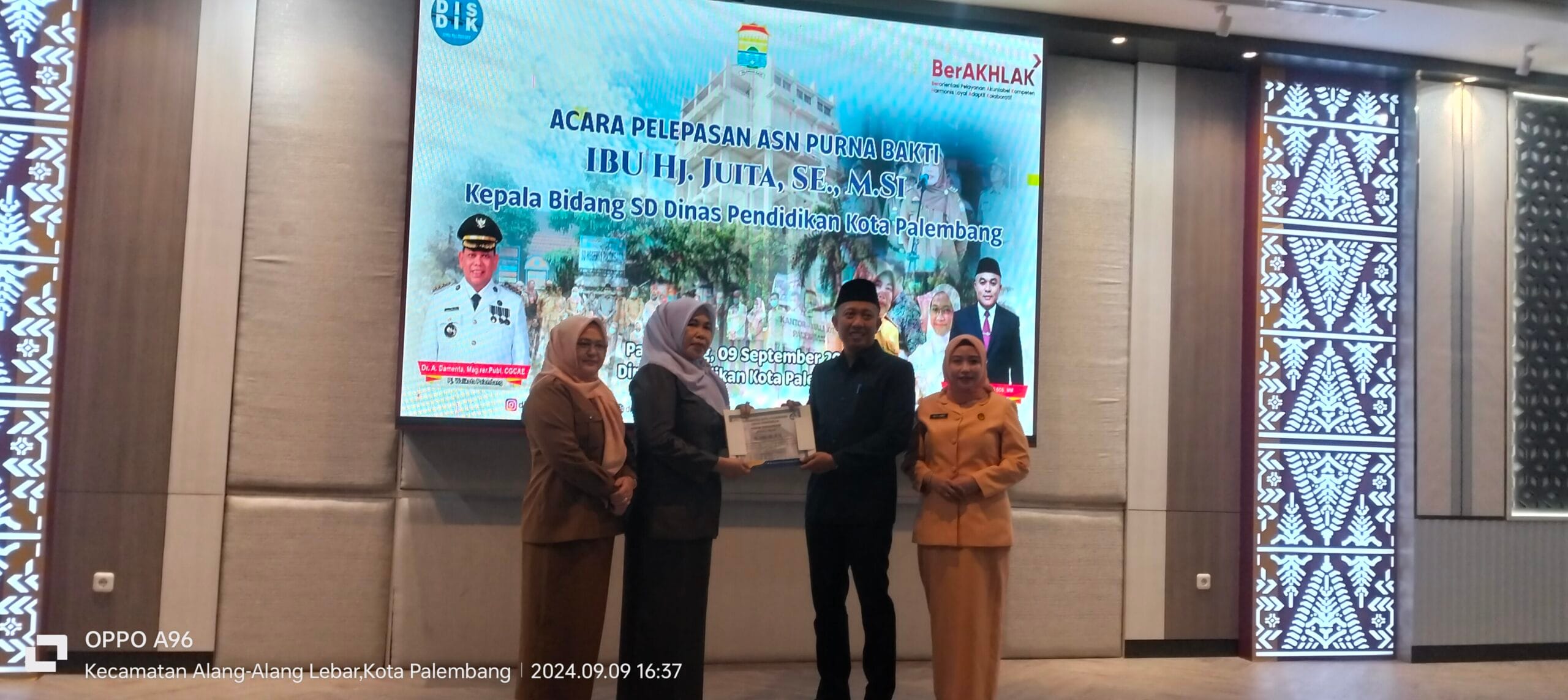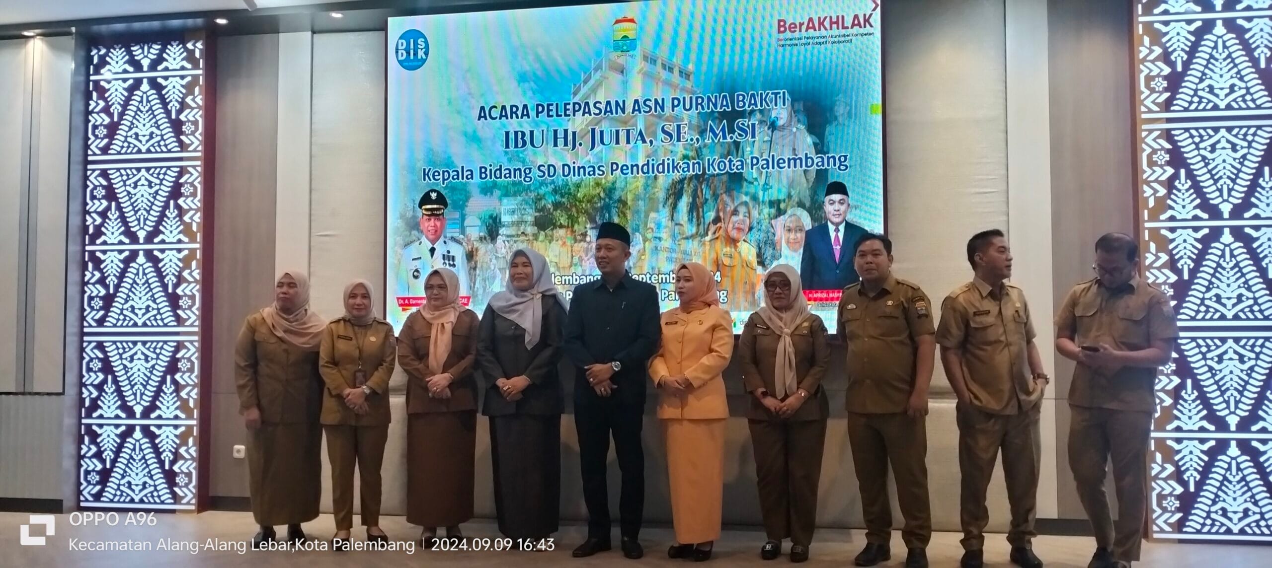 Acara Pelepasan ASN Purna Bakti Kepala Bidang SD Dinas Pendidikan Kota Palembang Hj Juitah,SE,MSi bertempat di Aula Disdik Palembang, Senin 9 September 2024.