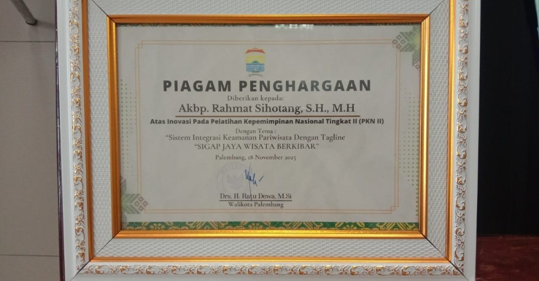 Upaya memperkuat keamanan destinasi wisata di Kota Palembang memasuki babak baru. Dalam kegiatan Pelatihan Sistem Integrasi Keamanan Pariwisata yang digelar di Ruang Parameswara Pemerintah Kota Palembang, Selasa (18/11/2025), AKBP Rahmat Sihotang, S.H., M.H. meraih penghargaan atas inovasinya pada Pelatihan Kepemimpinan Nasional Tingkat II (PKN II). Inovasi tersebut mengusung tema “Sistem Integrasi Keamanan Pariwisata dengan Tagline Sigap Jaya Wisata Berkibar”.