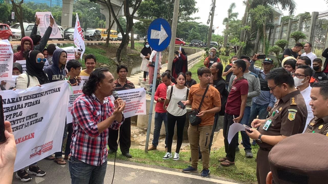Puluhan masa yang tergabung dalam Aliansi Tegakkan Hukum Keadilan melakukan aksi demo di gedung Kejati Sumsel mendesak untuk segera membebaskan terdakwa Juperlius dalam kasus penyalahgunaan Narkoba.