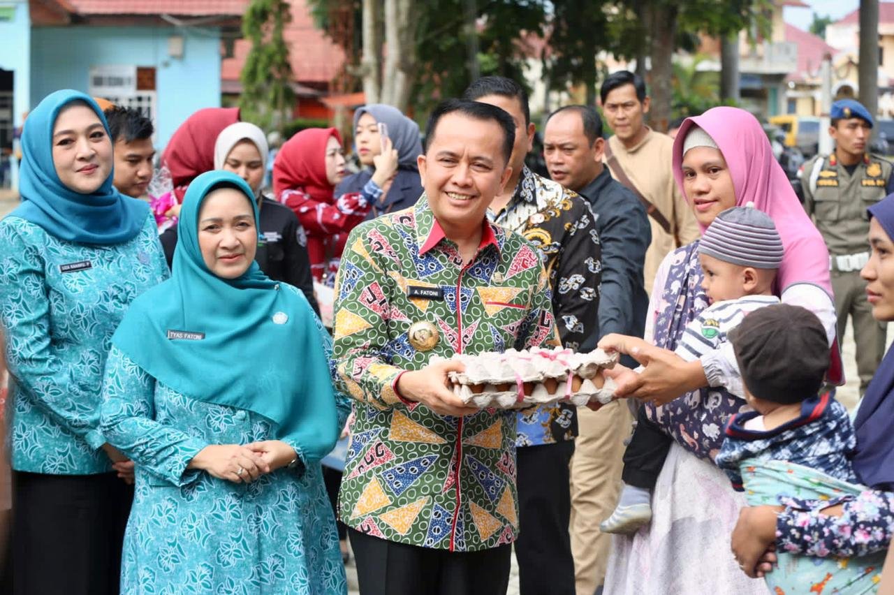 Penjabat (Pj) Gubernur Sumatera Selatan (Sumsel) Agus Fatoni bersama Ketua Tim Penggerak (TP) Pemberdayaan Kesejahteraan Keluarga (PKK) Sumsel Tyas Fatoni membagikan telur dan makanan tambahan bagi warga Kota Pagaralam. Bantuan tersebut merupakan bagian dari aksi nyata dalam mengatasi stunting di Provinsi Sumatera Selatan, khususnya Kota Pagar Alam.