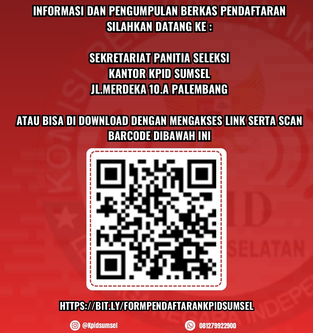Proses pendaftaran seleksi berkas anggota KPID Sumsel sudah mulai dibuka mulai tanggal 22 September 2025 hingga 31 Oktober 2025. Format pendaftaran bisa langsung diambil di Sekretariat Panitia Seleksi : Kantor KPID Sumsel Jl. Merdeka No. 10A Kota Palembang atau bisa scan barcode dibawah ini :
