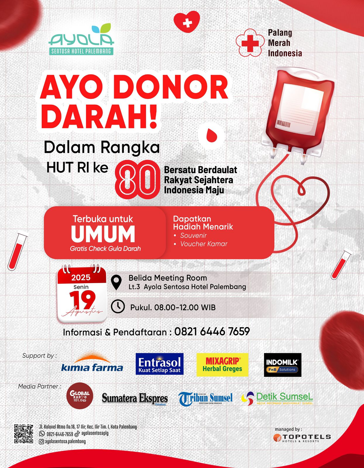 Dalam rangka memperingati Hari Ulang Tahun Republik Indonesia (HUT RI) ke-80, Ayola Sentosa Hotel Palembang bekerja sama dengan Palang Merah Indonesia (PMI) akan menyelenggarakan kegiatan donor darah. Acara ini merupakan wujud nyata komitmen Ayola Sentosa Hotel dalam mendukung kesehatan masyarakat secara konsisten berupaya memenuhi kebutuhan darah di fasilitas kesehatan. Kegiatan ini tidak hanya menjadi wujud nyata komitmen Ayola Sentosa Hotel dalam mendukung kesehatan dan kesejahteraan masyarakat, tetapi juga sebagai refleksi semangat kebangsaan yang terkandung dalam tema HUT RI ke-80: “Bersatu Berdaulat, Rakyat Sejahtera, Indonesia Maju”.