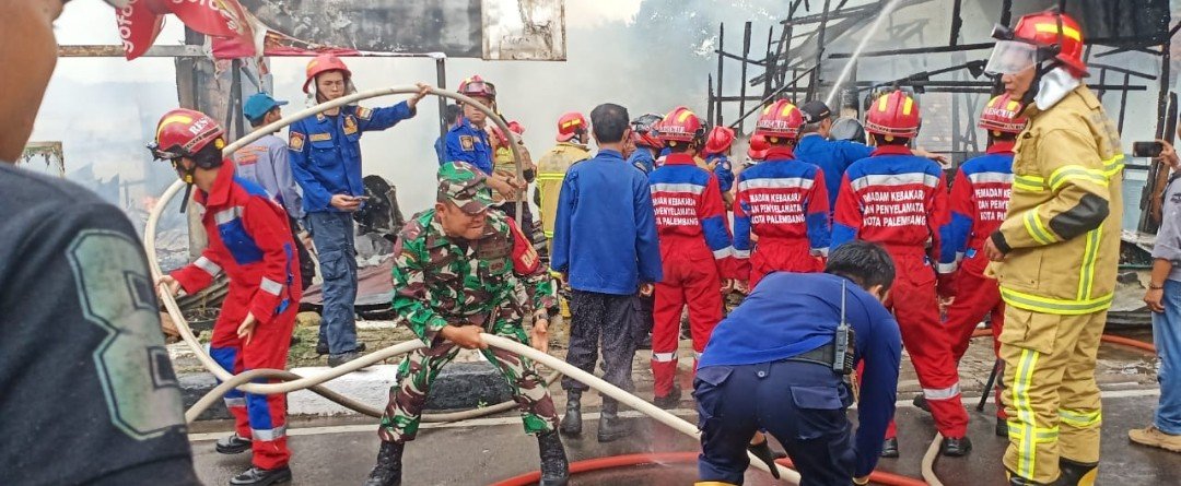 Babinsa bersama personel Zidam II/Sriwijaya, anggota Polsek Ilir Barat I, serta petugas Pemadam Kebakaran bahu-membahu berjibaku melawan api. Tanpa ragu, mereka ikut menarik selang, mengatur aliran air, dan membantu mengevakuasi area sekitar lokasi kebakaran.