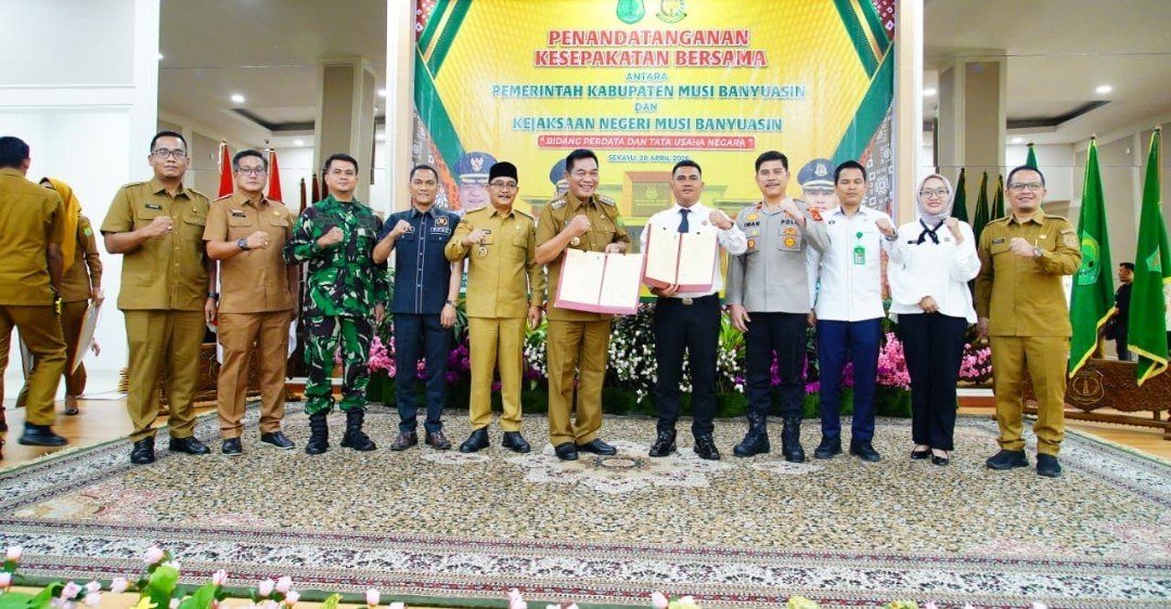 Perkuat tata kelola pemerintahan yang baik dan aman secara hukum, Pemerintah Kabupaten Musi Banyuasin (Pemkab Muba) bersama Kejaksaan Negeri Muba menandatangani Naskah Kesepakatan Bersama Bidang Perdata dan Tata Usaha Negara. Penandatanganan digelar pada Senin (20/4/2025) di Guest House Griya Bumi Serasan Sekate.