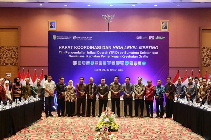 Penjabat (Pj) Gubernur Sumatera Selatan (Sumsel) Elen Setiadi, S.H. M.S.E memimpin langsung Rapat Koordinasi dan High Level Meeting Tim Pengendali Inflasi Daerah (TPID) se-Sumsel dan Sosialisasi Kegiatan Pemeriksaan Kesehatan Gratis, di Ballroom Hotel Aryaduta Palembang, Kamis (23/1/2025) siang.