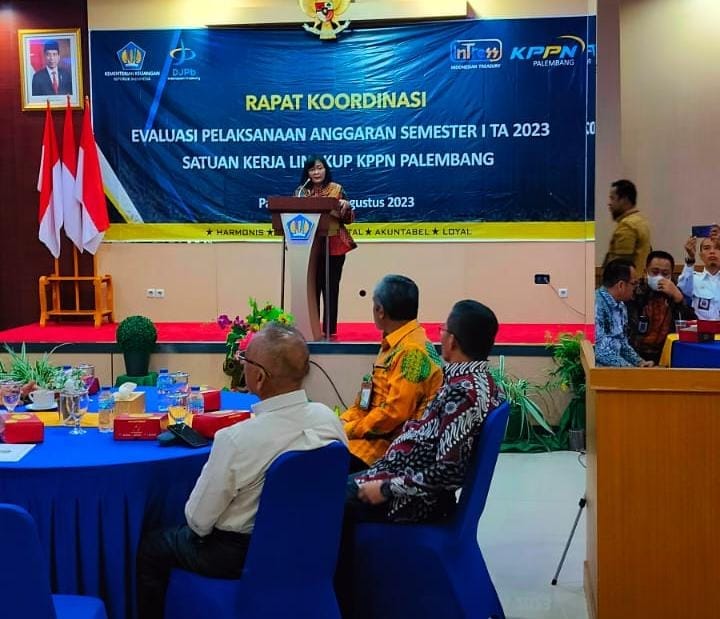 Kementerian Keuangan Republik Indonesia (Kemenkeu RI), Direktorat Jenderal Pembendaharaan (DJPb) provinsi Sumatera Selatan (Sumsel) bersama dengan Kantor Pelayanan Perbendaharaan Negara (KPPN) Palembang hari ini melaksanan Rapat Koordinasi (Rakor) mengenai evaluasi pelaksanaan anggaran semester I Tahun Anggaran (TA) 2023 di Satuan Kerja Lingkup KPPN Palembang yang dipusatkan di aula , Kamis (31/8/2023).