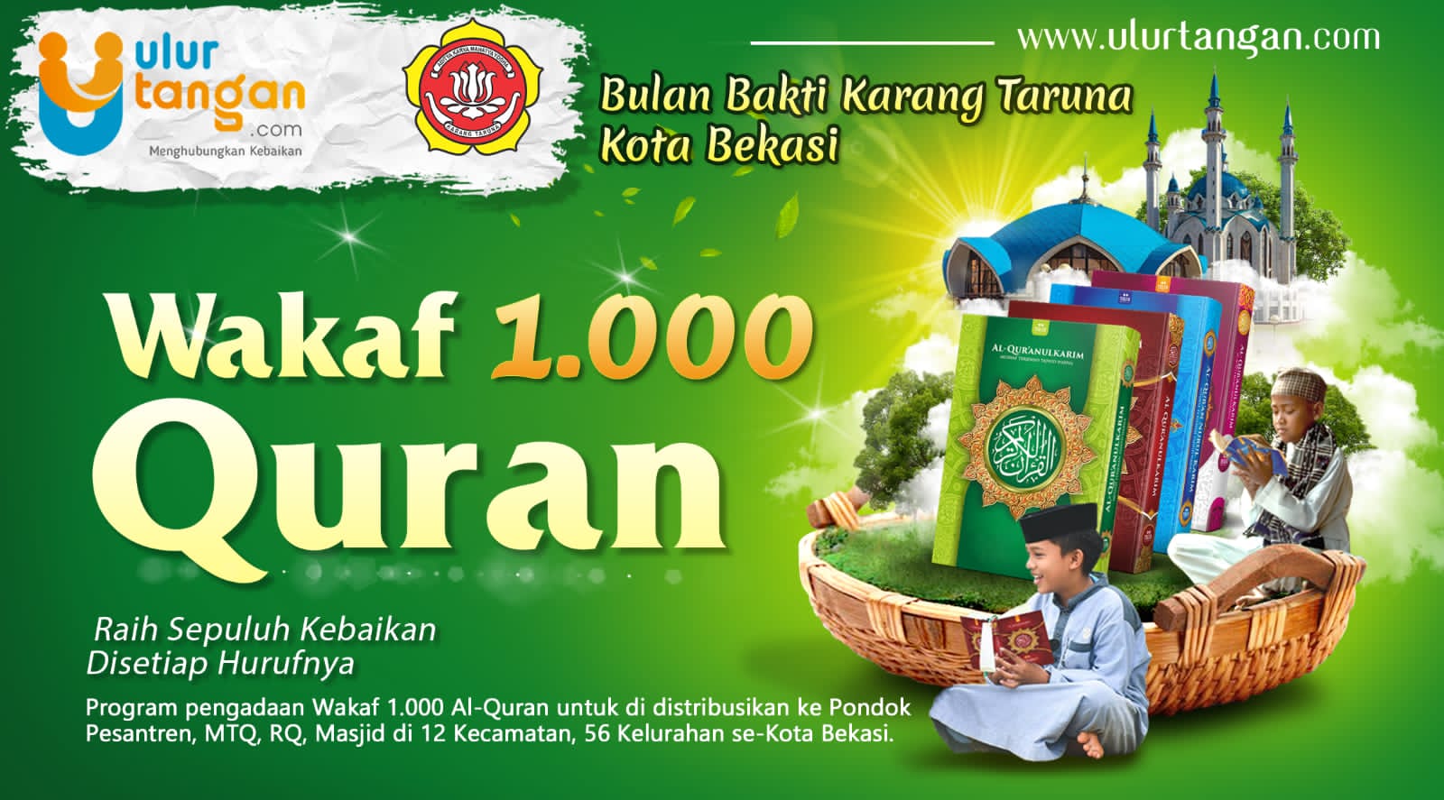Karang Taruna Kota Bekasi bekerja sama dengan Ulurtangan mengumumkan kampanye donasi wakaf Al-Qur’an dengan tujuan mengumpulkan 1000 Al-Qur’an untuk disalurkan kepada masjid dan majelis taklim di seluruh Kota Bekasi. Penggalangan donasi ini akan berlangsung hingga tanggal 15 Oktober 2023.