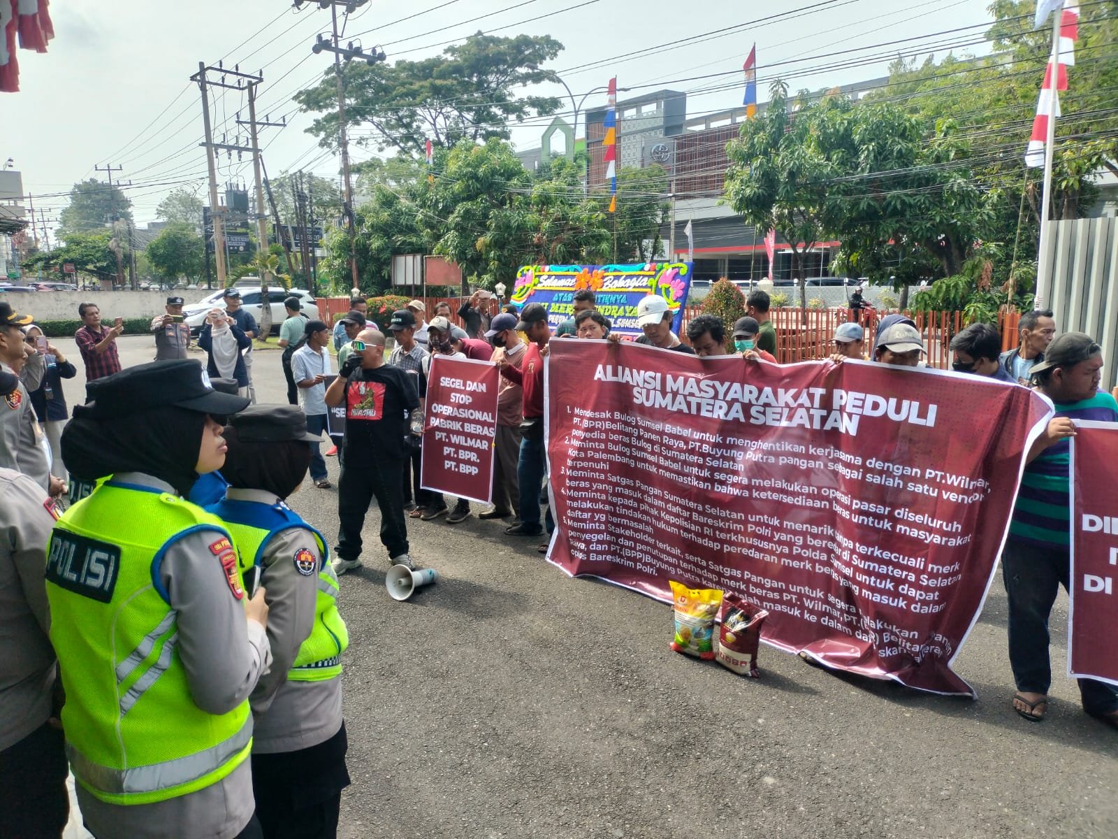 Puluhan massa yang tergabung dalam Aliansi Aksi Masyarakat Peduli Sumatera Selatan (Sumsel) mengultimatum Perum Bulog Sumatera Selatan dan Bangka Belitung (Sumsel Babel) untuk segera memutus kerja sama dengan tiga perusahaan pemasok beras yang diduga terlibat dalam skandal beras oplosan.