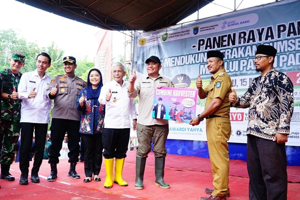 Guna mendorong produtifitas padi di OKI lebih meningkat dalam kesempatan yang sama Gubernur Herman Deru menyerahkan sejumlah bantuan yang diperuntukkan bagi petani Desa Tugu Jaya, berupa 1 unit combine harvester, 2 unit pompa air 6 inch, 1 unit traktor roda 2, dan 1 unit traktor roda empat.