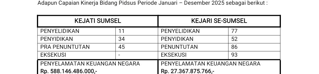 Dugaan Tindak Pidana Korupsi dalam pemberian Kredit Usaha Rakyat (KUR) Mikro dan Pengelolaan Aset Kas Besar (Khasanah) pada salah satu bank plat merah Kantor Cabang Pembantu Semendo Kabupaten Muara Enim tahun 2022 s.d. 2024. Jumlah tersangka sebanyak 7 (Tujuh) orang. Perkiraan Kerugian Negara Kurang Lebih Rp. 12M (Proses Penyidikan)