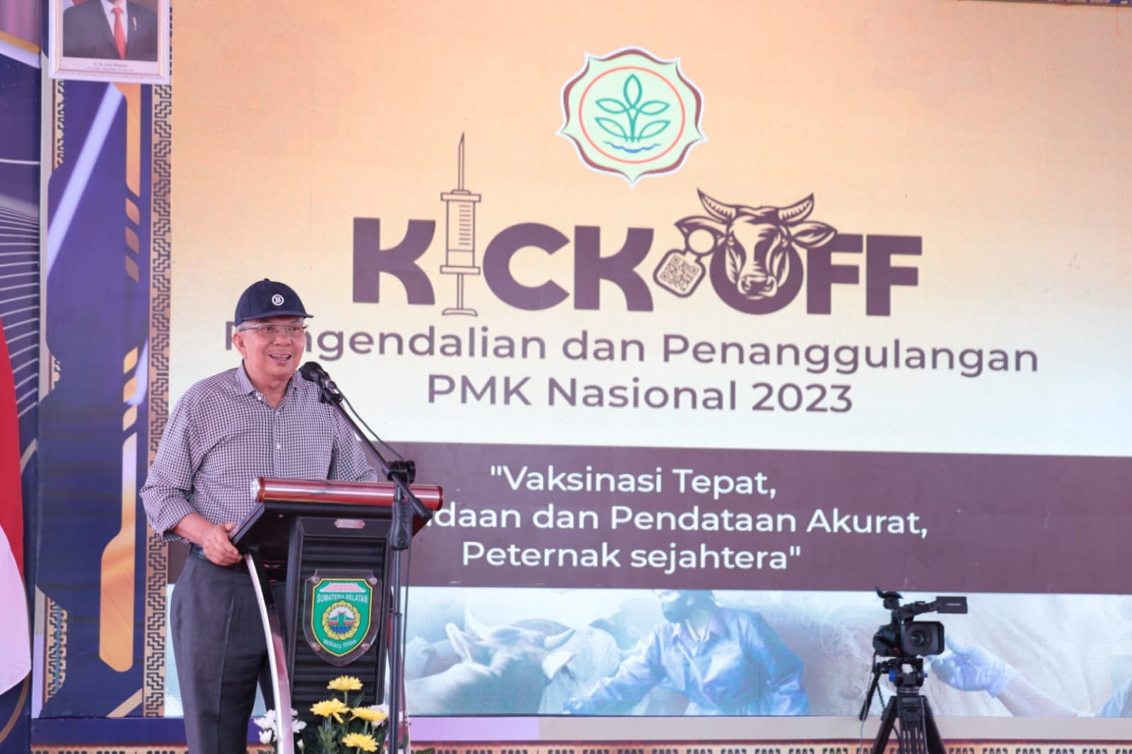 Wakil Gubernur Sumsel H Mawardi Yahya disela-sela mengikuti kick of vaksinasi PMK secara nasional tahun 2023 secara virtual bertempat di Asosiasi Peternak dan Penjual Hewan Qurban Kota Palembang, Muhammad Idil Fitriansyah Jala Pangeran Ayin, Kecamatan Sako Palembang, Sabtu (28/1) pagi menegaskan, Pemprov Sumsel melalui Dinas Ketahanan Pangan dan Peternakan telah melakukan vaksinasi PMK bagi ribuan hewan ternak di Sumsel.