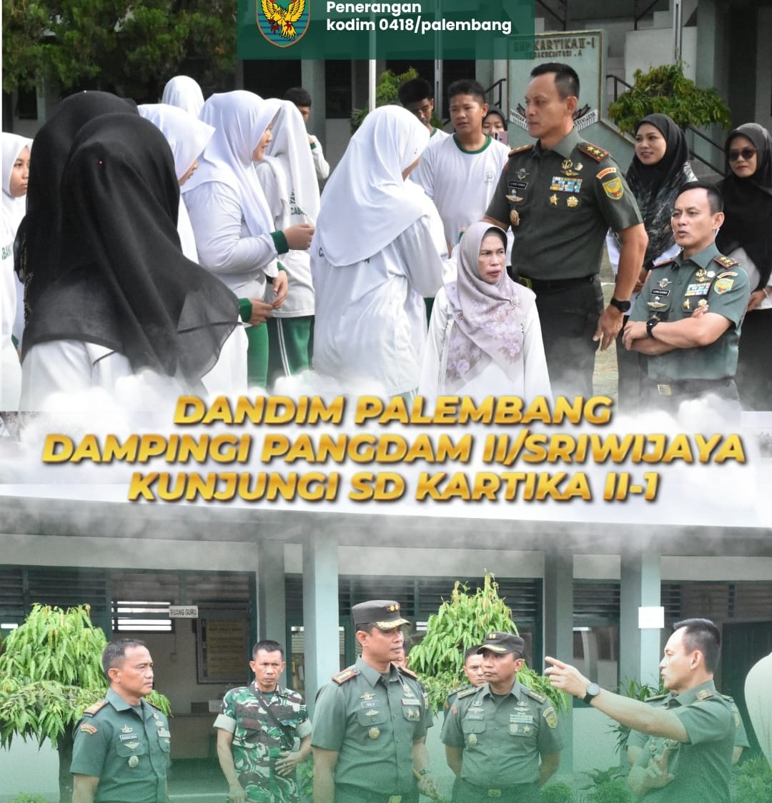Komandan Kodim 0418/Palembang Letkol Arh Erik Novianto, S.Sos mendampingi Pangdam II/Sriwijaya Mayjen TNI Ujang Darwis, M.D.A dalam kunjungan kerja ke SD Kartika II-1, yang berlokasi di Jalan Ratu Sianum, Kelurahan 3 Ilir, Kecamatan Ilir Timur II, Kota Palembang, Selasa (22/10/2025).