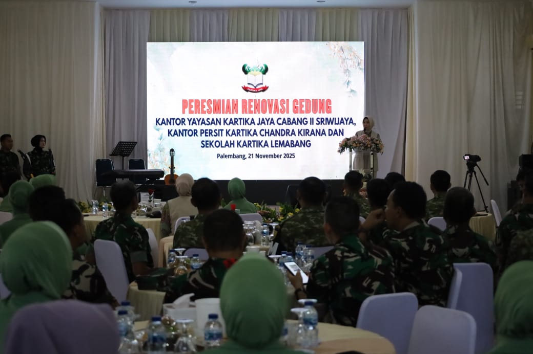 Pada Jumat (21/11/2025) pukul 10.00 WIB, Dandim 0418/Palembang Letkol Arh Erik Novianto, S.Sos menghadiri peresmian Kantor Yayasan Kartika Jaya Cabang II Sriwijaya. Kegiatan berlangsung di Aula Persit Kartika Chandra Kirana Cabang II Sriwijaya, Jalan Manunggal, Kelurahan 30 Ilir, Kecamatan Ilir Barat II Palembang.