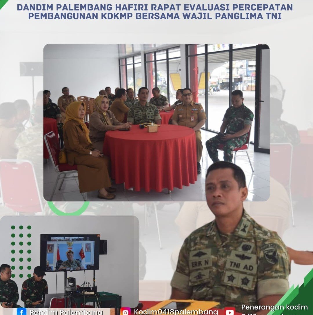 Komandan Kodim 0418/Palembang Erik Novianto mengikuti kegiatan rapat evaluasi percepatan pembangunan Koperasi Desa Kelurahan Merah Putih (KDKMP) secara daring,Bersama Wakil Panglima TNI Jendral TNI Tandyo Budi Revita ,Selasa (10/3/2026).