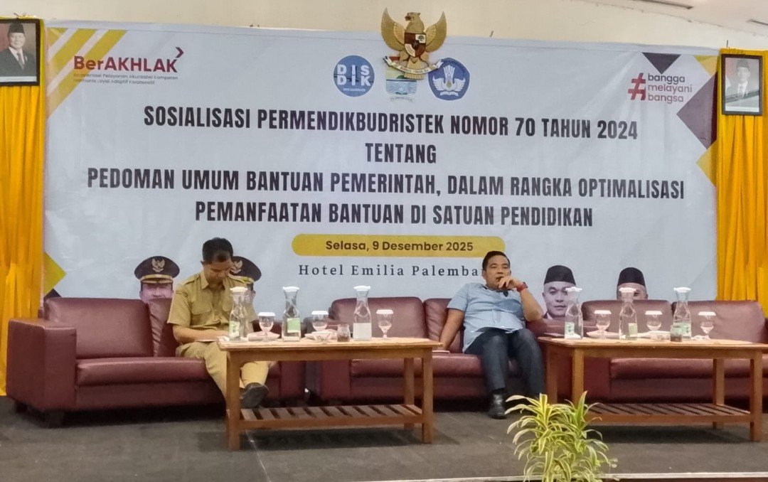 Dinas Pendidikan Kota Palembang menggelar Sosialisasi Permendikbudristek Nomor 70 Tahun 2024 tentang Pedoman Umum Bantuan Pemerintah dalam Rangka Optimalisasi Pemanfaatan Bantuan Satuan Pendidikan di Hotel Emilia, Selasa (9/12/2025).