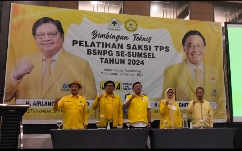 Bimbingan Teknis Pelatihan Saksi TPS Badan Saksi Nasional Partai Golkar (BSNPG) se Sumsel Tahun 2024 dilaksanakan di Hotel Harper, Sabtu (20/1/2024). Hadir Ketua DPD Golkar Sumatera Selatan (Sumsel) Bobby Adhityo Rizaldi.