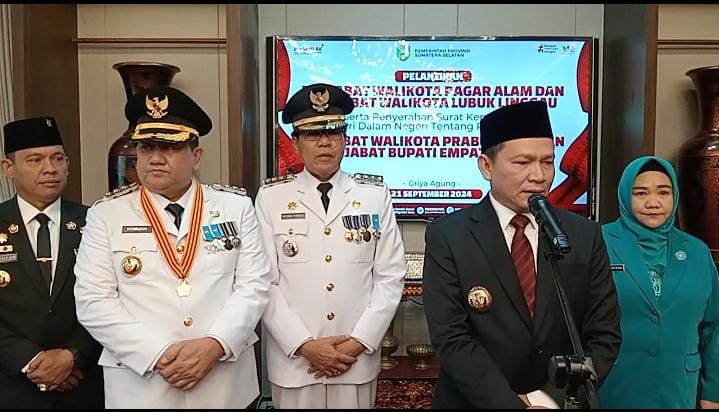 Pemerintah Provinsi (Pemprov) Sumatera Selatan (Sumsel) dalam hal ini Penjabat Gubernur Sumsel Elen Setiadi, SH., MSE dengan didampingi Penjabat Ketua Tim Penggerak Pemberdayaan dan Kesejahteraan Keluarga (TP PKK) Provinsi Sumsel Ny Meiza Elen Setiadi, SE menghadiri serta melakukan pelantikan untuk Penjabat Walikota Pagar Alam dan Penjabat Walikota Lubuk Linggau serta penyerahan Surat Keputusan (SK) Menteri Dalam Negeri (Mendagri RI) tentang Perpanjangan Penjabat Walikota Prabumulih, dan Penjabat Bupati Empat Lawang.