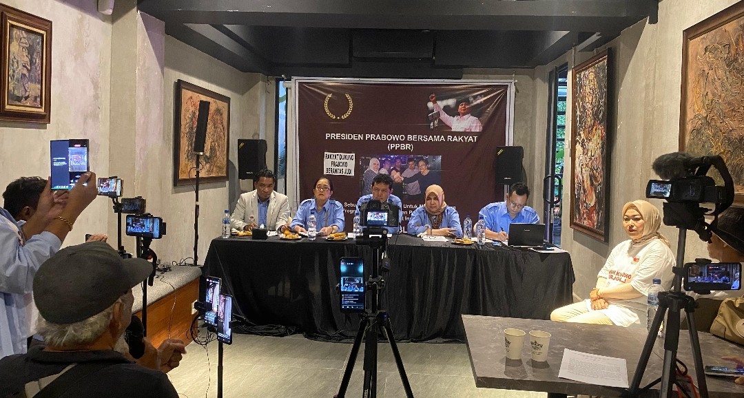 Saat jumpa pers, Koordinator PPBR Yudi Syamhudi Suyuti ditemani Nelly Siringoringo (JAKI Kemanusiaan Inisiatif), Abdul Ghani Ngabalin (Komando Barisan Rakyat / KOBRA 08), Ibrahim Martabaya (Barisan Relawan Tangguh Prabowo Subianto/BARET 08), Asma Dewi.