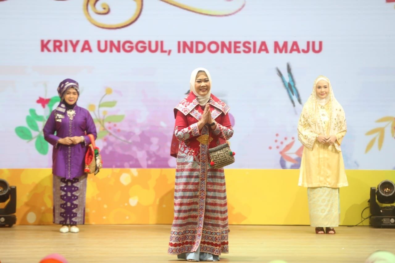 Ketua TP PKK yang juga selaku Ketua Deksranasda Sumsel Hj Febrita Lustia HD menampillkan Kain Tajung Khas Sumsel dalam ajang fashion show dan Pameran Kriyanusa 2023 yang dibuka