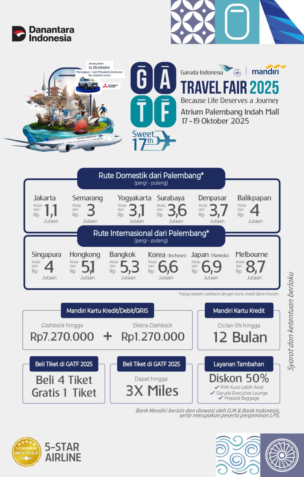 Garuda Indonesia Travel Fair (2025) Kota Palembang resmi mulai digelar. Dengan menggandeng Bank Mandiri sebagai bank partner, GATF di Kota Palembang akan berlangsung mulai tanggal 17-19 Oktober 2025 bertempat di Atrium Palembang Indah Mall.