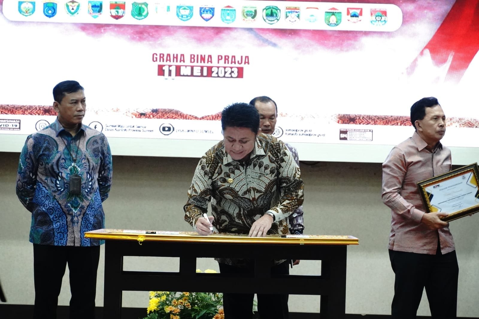 Hadir dalam kesempatan tersebut Ketua DPRD Provinsi Sumsel Hj. R.A Anita Noeringhati, Sekda Provinsi Sumsel Ir. S.A. Supriono, Kepala BPKP Perwakilan Provinsi Sumsel Buyung, Wiromo Samudro SE.MBA serta sejumlah Bupati/Walikota se Sumsel.