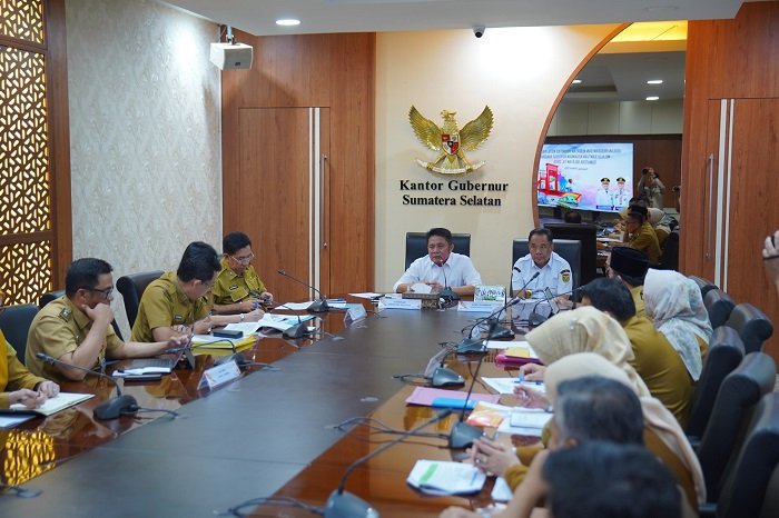 Gubernur Sumatera Selatan (Sumsel) H Herman Deru didampingi oleh Wakil Gubernur (Wagub) H Cik Ujang menyimak secara langsung paparan Walikota Palembang Ratu Dewa, mengenai usulan program dan kegiatan prioritas Kota Palembang melalui bantuan keuangan bersifat khusus tahun anggaran 2025, bertempat di Ruang Rapat Kantor Gubernur Sumsel, Selasa (25/3/2025) siang.