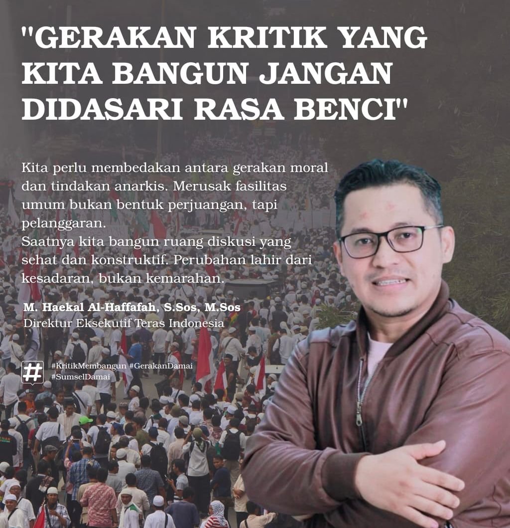 Lebih jauh, ia menegaskan bahwa gerakan kritik tidak boleh didasari kebencian. “Kita sepakat bahwa pelaku rusuh harus ditindak agar orang bisa berpikir bahwa gerakan moral itu berbeda dengan gerakan anarkis. Merusak fasilitas berbeda dengan gerakan yang membawa isu-isu substantif,” kata Haekal.