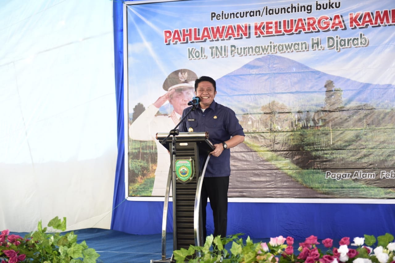 Gubernur Sumsel H Herman Deru melaunching buku Pahlawan Keluarga Kami (PKK) Kolonel TNI Purn. Djarab di Desa Pelangkenidai, Pagaralam, Selasa (21/2).