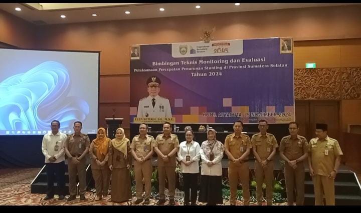 Pemerintah Provinsi (Pemprov) Sumatera Selatan (Sumsel) dalam hal ini Penjabat Gubernur Sumsel Elen Setiadi, S.H., MSE diwakili oleh Kepala Inspektorat Provinsi Sumsel Kurniawan, A.P., M.Sri menghadiri kegiatan serta membuka kegiatan pembukaan bimbingan teknis monitoring dan evaluasi pelaksanaan percepatan stunting di provinsi Sumsel Tahun 2024 yang dipusatkan di grand ballroom Arya Duta Hotel Palembang, Senin(25/11/2024).