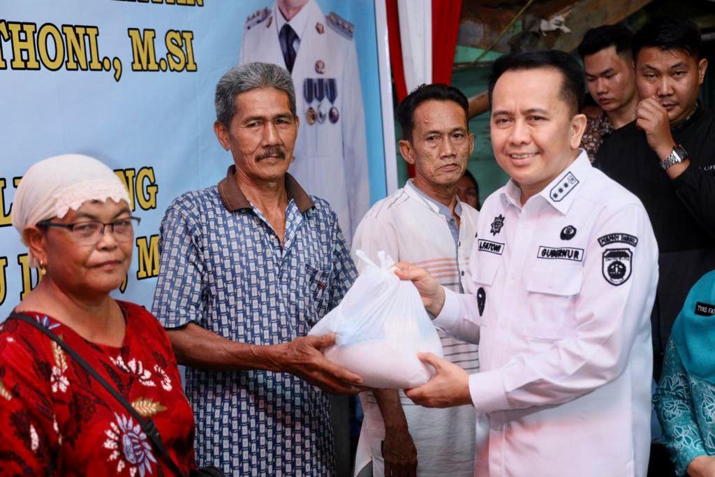 Penjabat (Pj) Gubernur Sumatera Selatan (Sumsel) Agus Fatoni bersamaan Pj Ketua Tim Penggerak (TP) Pemberdayaan dan Kesejahteraan Keluarga (PKK) Sumsel Tyas Fatoni membagikan bingkisan paket sembilan bahan pokok (Sembako) dan bantuan sosial (Bansos) yang diperuntukan bagi masyarakat penerima manfaat di Kota Palembang saat menjelang malam tahun baru 2024.