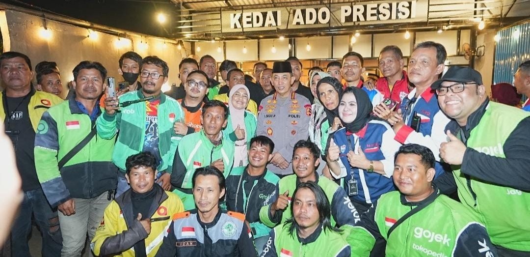 Kapolri Jenderal Polisi Drs. Listyo Sigit Prabowo, M.Si. menyambangi komunitas pengemudi ojek online di Kedai Ado, Jalan POM IX Kampus Palembang, Sabtu (7/3/2026) malam. Dalam suasana santai, Kapolri berdialog langsung dengan para driver yang tergabung dalam Asosiasi Driver Online (ADO) Palembang untuk mendengarkan aspirasi dan pengalaman mereka di lapangan.