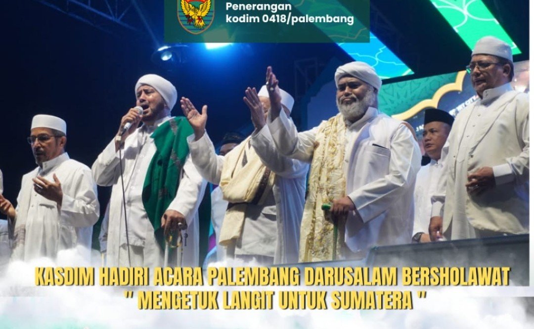 Mewakili Dandim 0418/Palembang, Kasdim Letkol Inf Dery Septriandi, S.T., M.M., M.Han menghadiri Acara Palembang Darussalam Bersholawat “Mengetuk Langit untuk Sumatera” bersama Habib Syech bin Abdul Qodir Assegaf, yang digelar pada Jumat malam (12/12/2025).