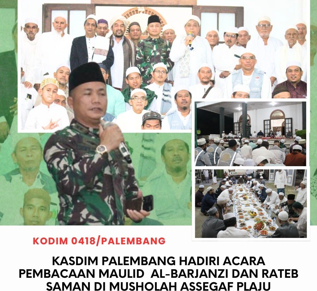 Dandim 0418/Palembang yang diwakili Kasdim Letkol Inf Dery Septriandi, S.T., M.M., M.Han menghadiri undangan Majelis Dzikir kegiatan pembacaan Maulid Al-Barzanji dan Rateb Saman yang digelar di Musholah Assegaf, Jalan D.I. Panjaitan 16 Ulu, Komplek Assegaf, Kecamatan Plaju, Selasa malam Rabu (17/02/2026)