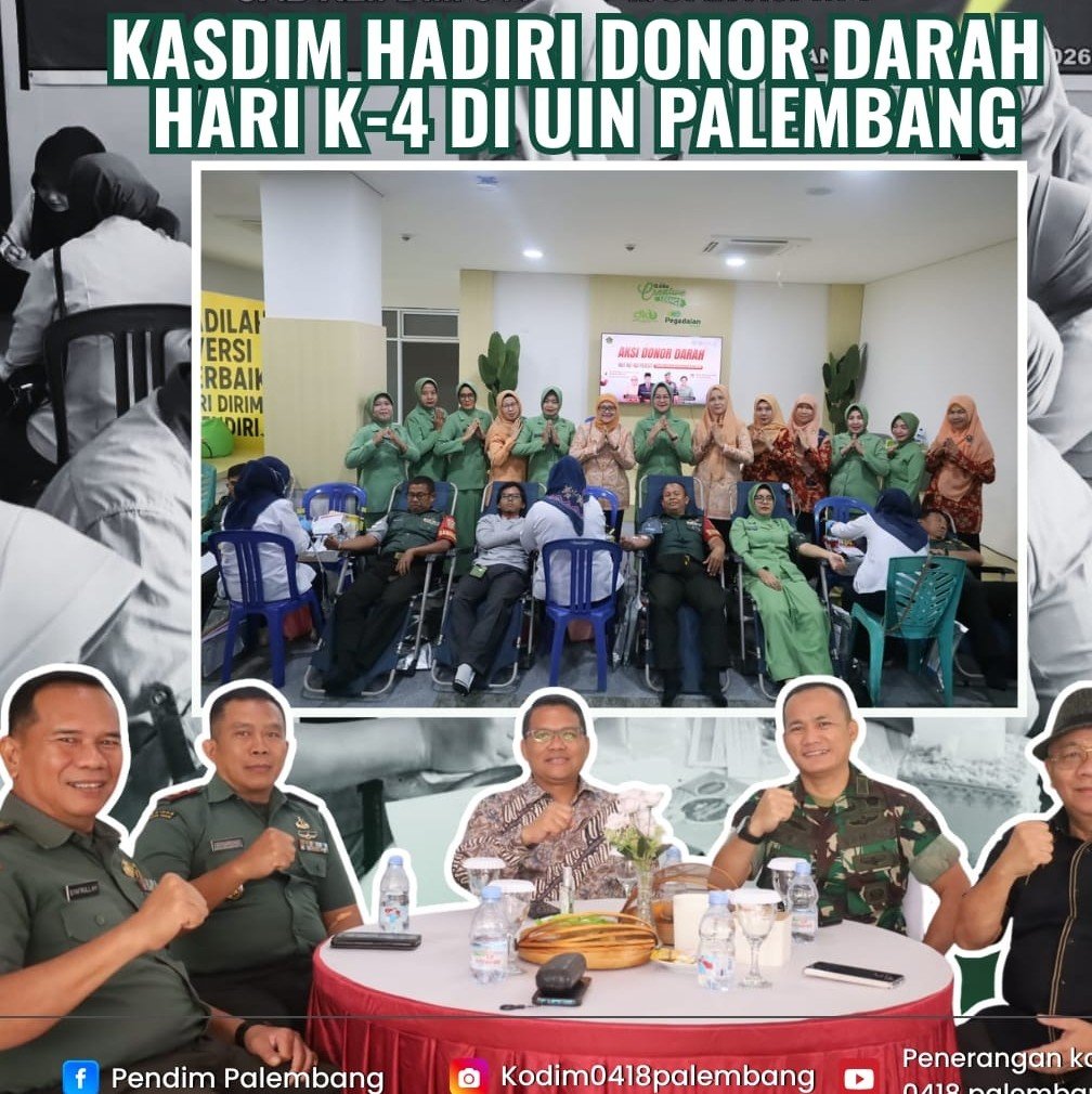 Kasdim 0418/Palembang Letkol Inf Dery Septriandi, S.T., M.M., M.Han mewakili Dandim 0418/Palembang memimpin langsung kegiatan donor darah dalam rangka memperingati Hari Ulang Tahun (HUT) ke-80 Persit Kartika Chandra Kirana Tahun 2026 yang digelar di Kantor Rektorat UIN Raden Patah Kampus B, Jalan Pangeran Ratu, 15 Ulu, Kecamatan Seberang Ulu I, Rabu (28/01/2026).