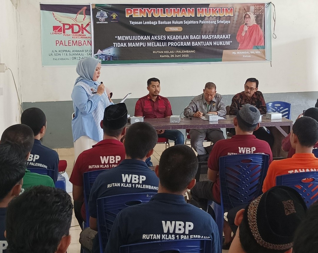 Pada hari ini, 26 Juni 2025 Rumah Tahanan Negara (Rutan) Kelas I Palembang menyelenggarakan kegiatan Penyuluhan Hukum bagi Warga Binaan Pemasyarakatan (WBP). Kegiatan ini dilaksanakan oleh Kasubsi Penyuluhan Hukum Rutan Kelas I Palembang bekerja sama dengan Yayasan Lembaga Bantuan Hukum Sejahtera Palembang Sriwijaya.