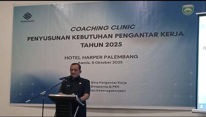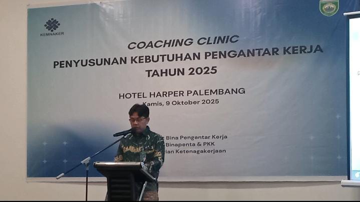 Kementerian Tenaga Kerja Republik Indonesia (Kemenaker RI) melalui Direktorat Bina Pengantar Kerja Direktorat Jenderal Kerja Binapenta dan PKK Kementerian Ketenagakerjaan bekerjasama dengan Pemerintah Provinsi (Pemprov) Sumatera Selatan (Sumsel) dalam hal ini Dinas Tenaga Kerja dan Transmigrasi (Disnakertrans) Provinsi Sumsel menyelenggarakan coaching clinic penyusunan kebutuhan pengantar kerja tahun 2025 bertempat di ruang meeting Hotel Harper Palembang, Kamis (9/10/2025).