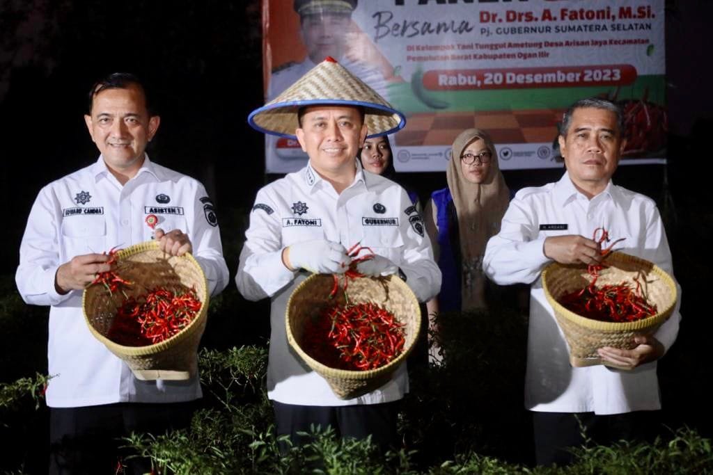 Berbagai upaya terus dilakukan Pemerintah Provinsi (Pemprov) Sumatera Selatan (Sumsel) untuk mengendalikan inflasi, salah satunya dengan melakukan panen raya. Penjabat (Pj) Gubernur Sumatera Selatan (Sumsel) Agus Fatoni bersama kelompok petani Tunggul Ametung melakukan Panen Raya Cabe Merah Keriting varietan Lado dan Akar di Desa Arisan Jaya, Pemulutan Barat I, Kabupaten Ogan Ilir, Rabu (20/12/2023).