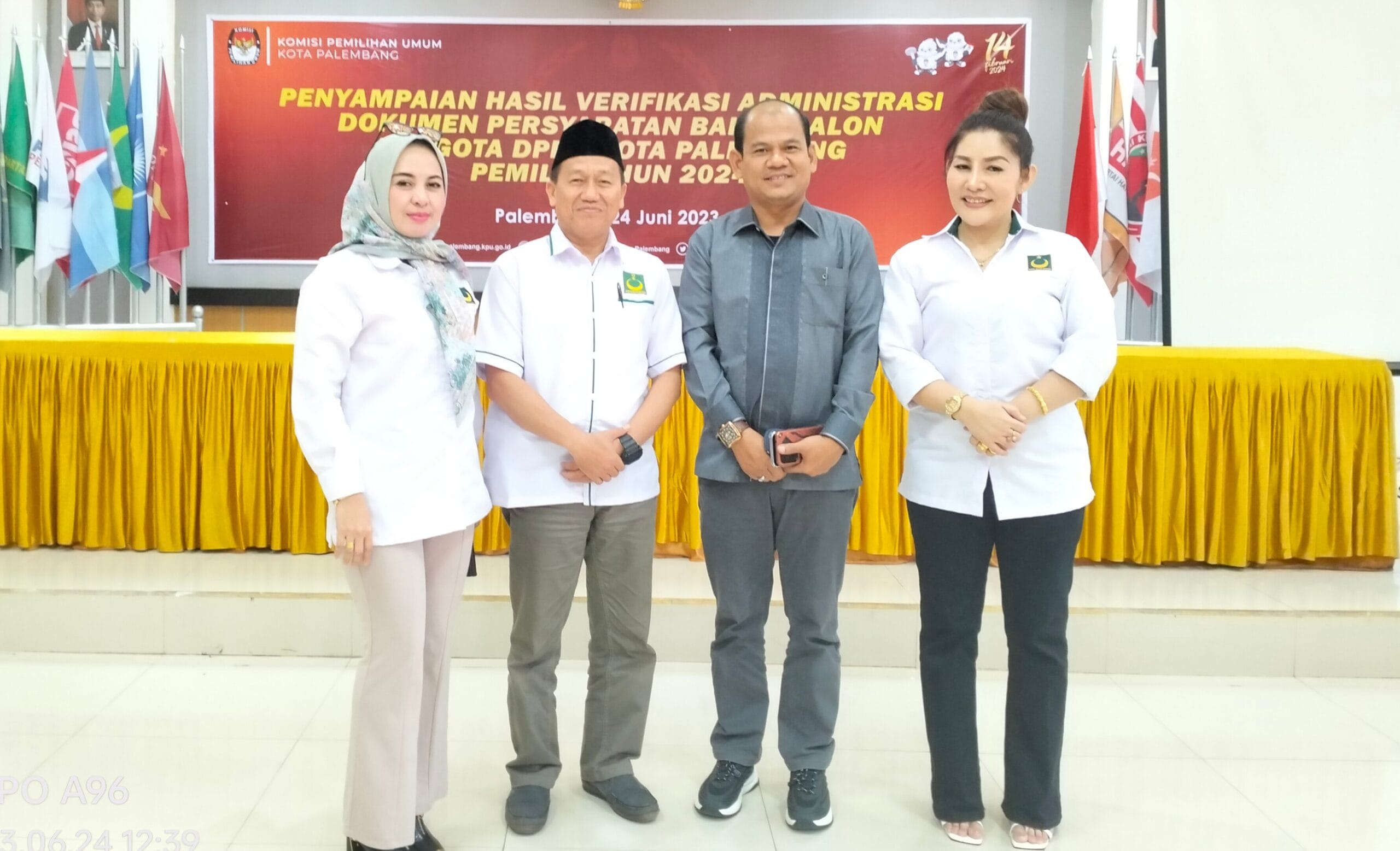 Penyampaian hasil verifikasi administrasi dokumen persyaratan Bakal calon Anggota DPRD Kota Palembang Pemilu tahun 2024 dilaksanakan di aula KPU Kota Palembang, Sabtu (24/6/2023). Hadir dari Partai Bulan Bintang (PBB) Kota Palembang, Ketua Bappilu Kota Palembang Yunidarti.