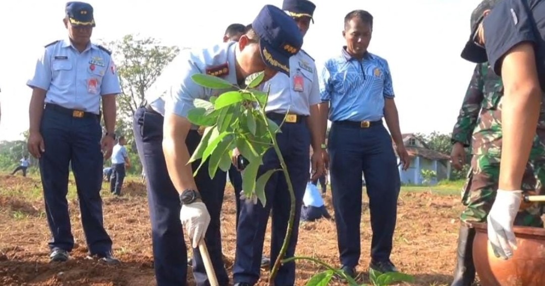 Komandan Lanud Sri Mulyono Herlambang Kolonel Penerbang Zulfikri Arif Purba, S.Sos., MS. (NSSS)., bersama pejabat dan anggota Lanud serta dari kantor Balai Pengelolaan Daerah Aliran Sungai Musi Provinsi Sumatera Selatan menanam pohon alpukat jenis siger di area kebun buah Ketahanan Pangan Lanud Sri Mulyono Herlambang, Kamis (28/8/2025).
