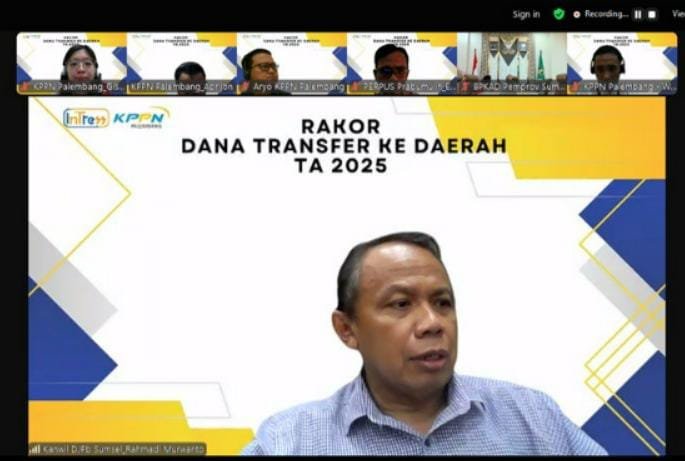 Kementerian Keuangan Republik Indonesia (Kemenkeu RI) Perwakilan Provinsi Sumatera Selatan (Sumsel) dalam hal ini Kantor Wilayah Direktorat Jenderal Perbendaharaan Sumsel dan bersama Kantor Pelayanan Perbendaharaan Negara (KPPN) Kota Palembang menggelar Rapat Koordinasi Penyaluran Dana Transfer Ke Daerah Tahun Anggaran 2025 secara virtual daring (online), Kamis (27/2/2025).