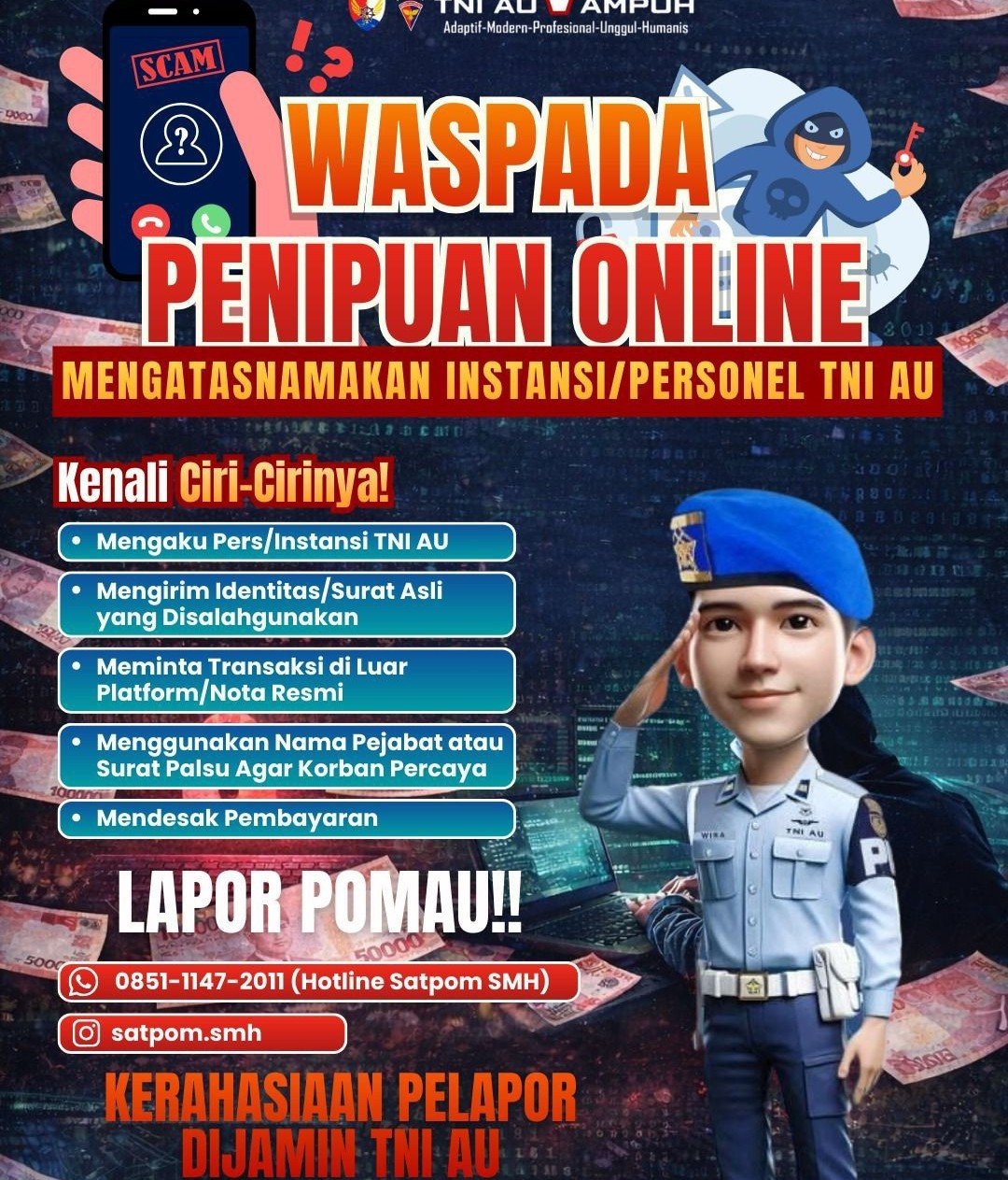 Lanud Sri Mulyono Herlambang (Smh) mengimbau kepada warga masyarakat kota Palembang agar mewaspadai penipuan online yang mengatasnamakan TNI AU.
