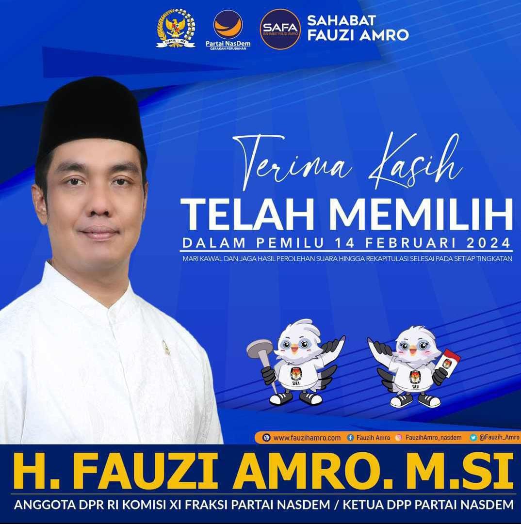 Lebih lanjut Fauzi Amro mengucapkan terima kasih untuk Semua Keluarga Besar, semua Infrastruktur Nasdem, semua Relawan SAFA & PP
