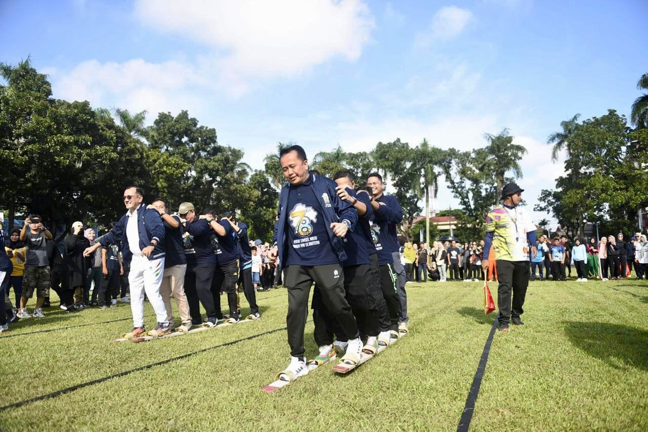 Penjabat (Pj) Gubernur Sumatera Selatan (Sumsel) Agus Fatoni didampingi Pj Ketua Tim Penggerak (TP) Pemberdayaan Kesejahteraan Keluarga (PKK) Tyas Fatoni bersama ribuan peserta mengikuti jalan santai. Kegiatan ini dilaksanakan dalam rangka memeriahkan peringatan Ulang Tahun (HUT) Provinsi Sumsel ke-78 Tahun 2024.