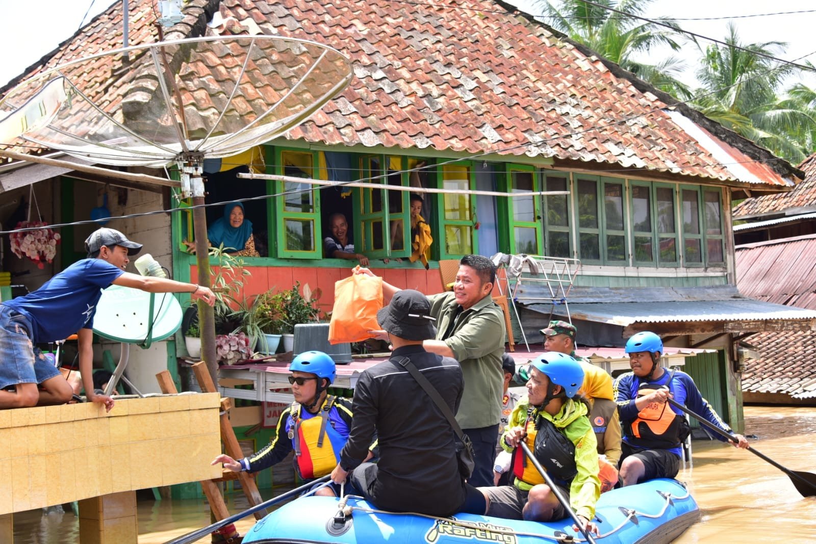 “Yang sabar dan jaga Kesehatan ya,” ucap Herman Deru dari atas kepada salah satu warga yang ada di salah satu rumah yang masih terendam banjir.