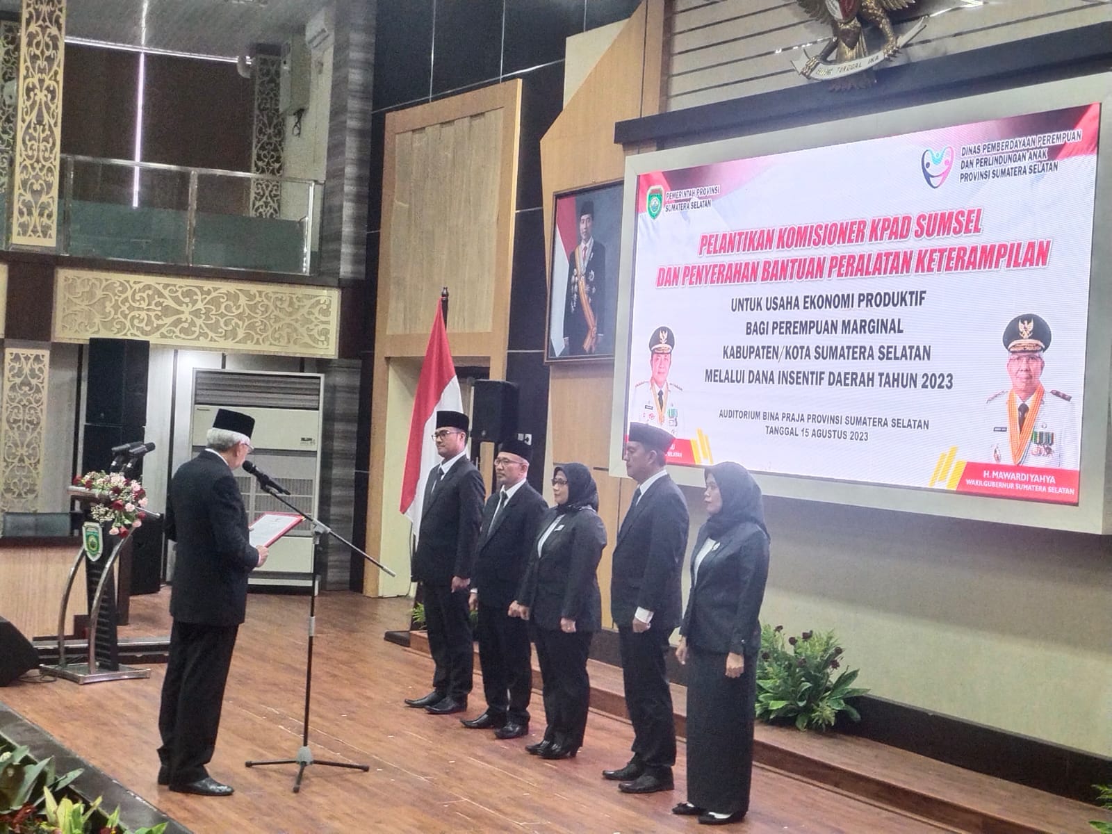 Wakil Gubernur (Wagub) H Mawardi Yahya dalam hal ini dari Pemerintah provinsi (pemprov) Sumatera Selatan (Sumsel) melakukan Pelantikan Komisioner Komisi Perlindungan Anak Daerah (KPAD) Sumsel dan penyerahan bantuan peralatan keterampilan untuk usaha ekonomi produktif bagi perempuan marginal kabupaten/kota Sumsel melalui dana insentif daerah tahun 2023.