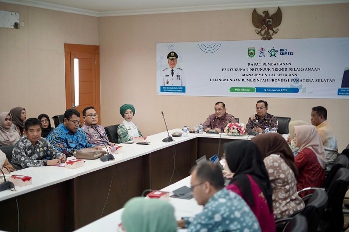 Sekretaris Daerah (Sekda) Provinsi Sumatera Selatan (Sumsel) Drs H Edward Candra MH memimpin rapat pembahasan penyusunan petunjuk teknis pelaksanaan manajemen talenta Aparatur Sipil Negara (ASN) dilingkungan Pemerintah Provinsi (Pemprov) Sumsel, bertempat di Aula BKD Provinsi Sumsel, Kamis (5/12/2024) Pagi.