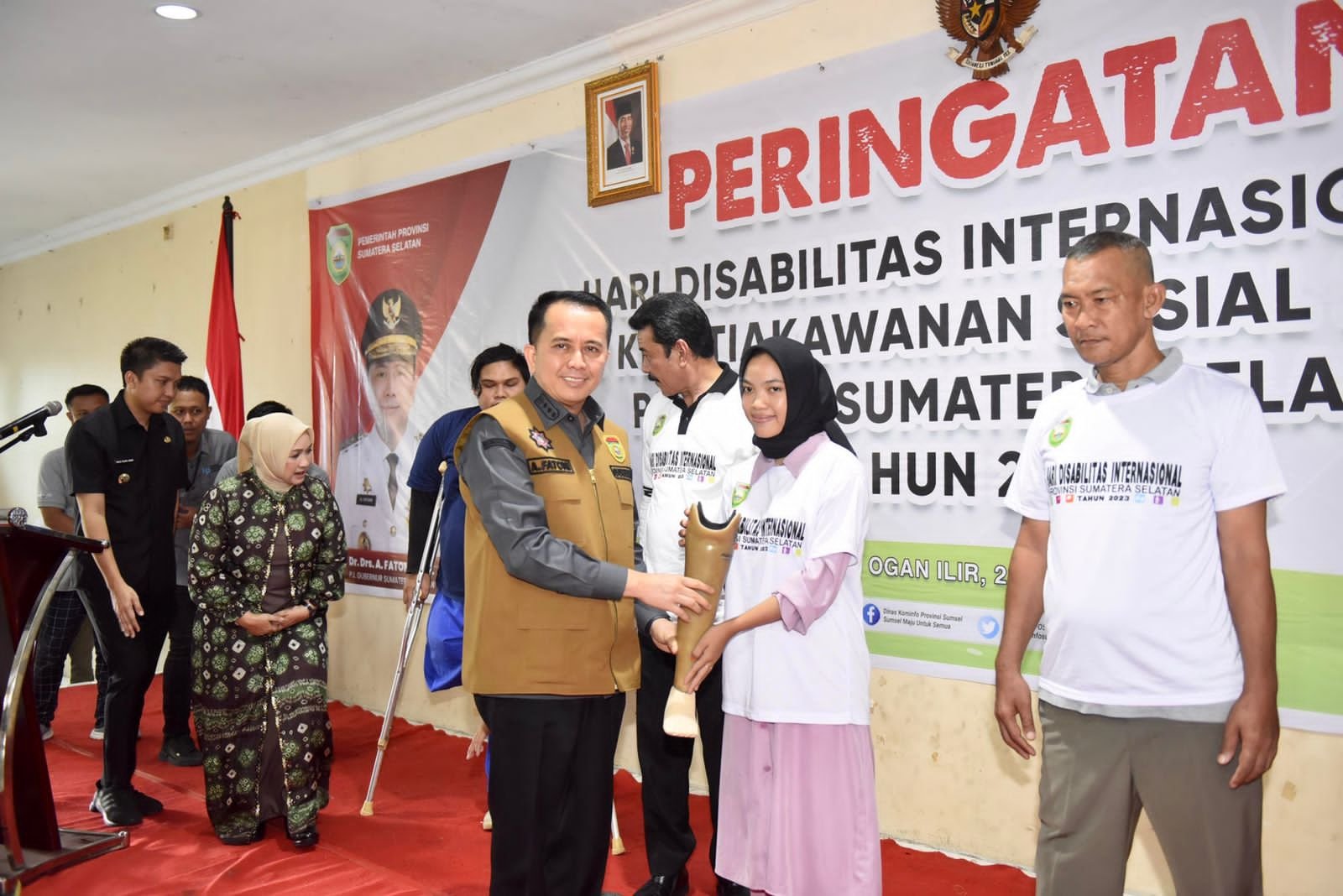 Dalam kesempatan yang sama, Kepala Dinas Sosial (Kadinsos) Provinsi Sumsel merinci pada peringatan HDI dan HKSN kali ini, Pemprov Sumsel melalui Dinas Sosial memberikan bantuan kaki palsu bagi disabilitas. Pemberian alat bantu disabilitas bagi 406 orang dengan rincian kursi roda sebanyak 162 buah, hearing aid sebanyak 32 buah, tongkat alat bantu jalan (kruck ketiak) sebanyak 42 buah, dan tongkat putih sebanyak 170 buah.