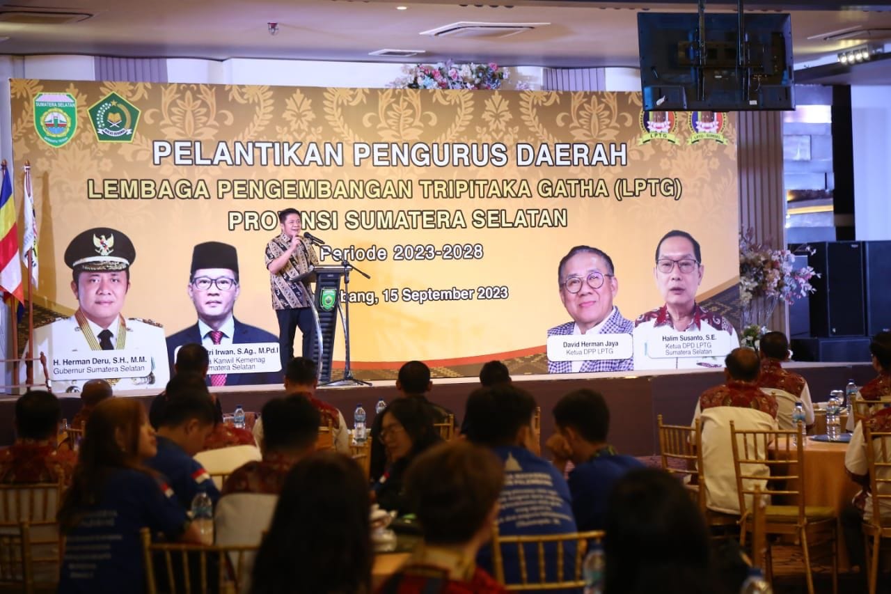 Gubernur Sumsel H. Herman Deru secara resmi melantik Pengurus DPD Lembaga Pengembangan Tripitaka Gatha (LPTG) Provinsi Sumsel Periode 2023-2028 di Selebrity Restaurant, Jumat (15/9).