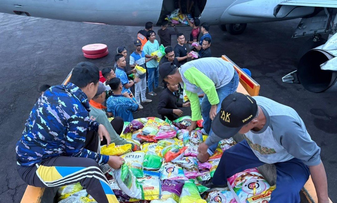 Sebanyak 8 ton bantuan bencana alam di Sumatera diterbangkan dari Lanud Sri Mulyono Herlambang (Smh) menggunakan pesawat Pesawat Boing AI-7304 TNI AU dari Skadron Udara 5 Lanud Sultan Hasanuddin, Makassar, Selasa (16/12/2025).