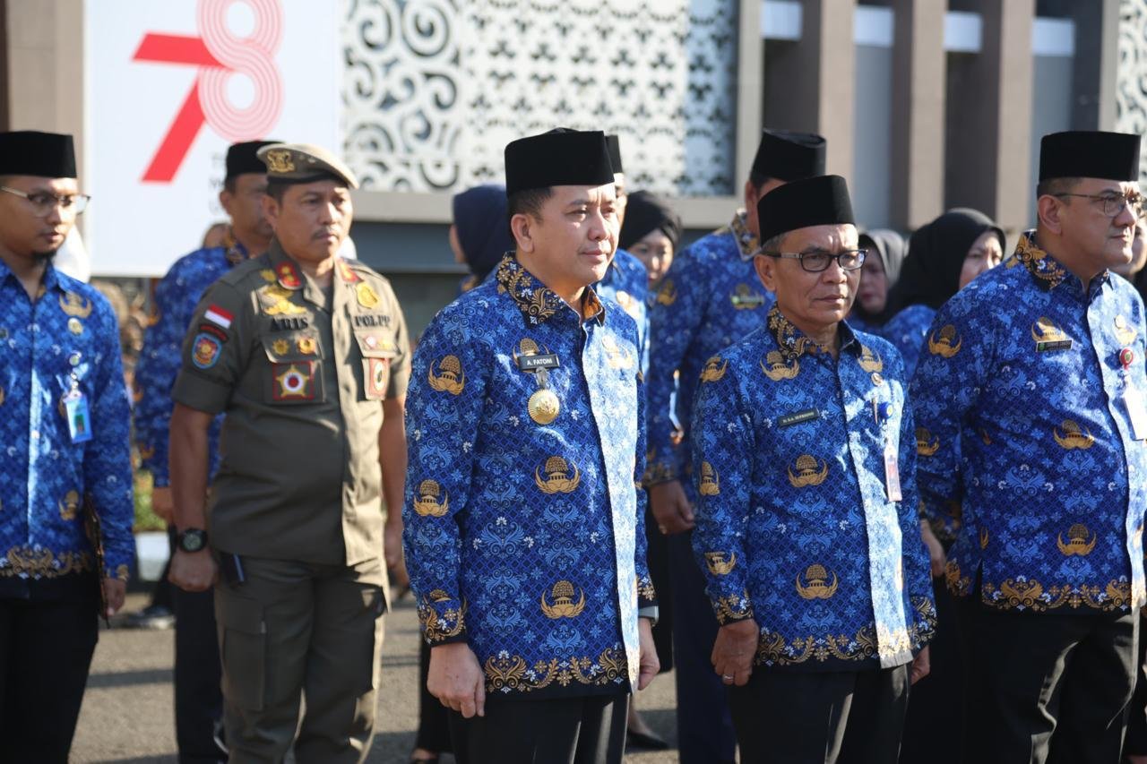 Penjabat (Pj) Gubernur Sumatera Selatan Agus Fatoni memimpin langsung Apel Gabungan Pegawai Pemprov Sumsel. Kegiatan ini berlangsung di Halaman Kantor Gubernur Sumsel, Palembang, Sumatera Selatan, Senin (19/2/2024).